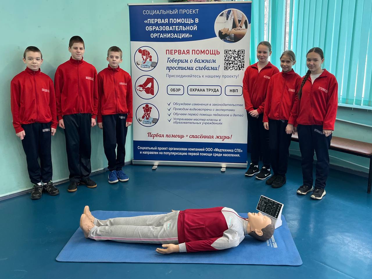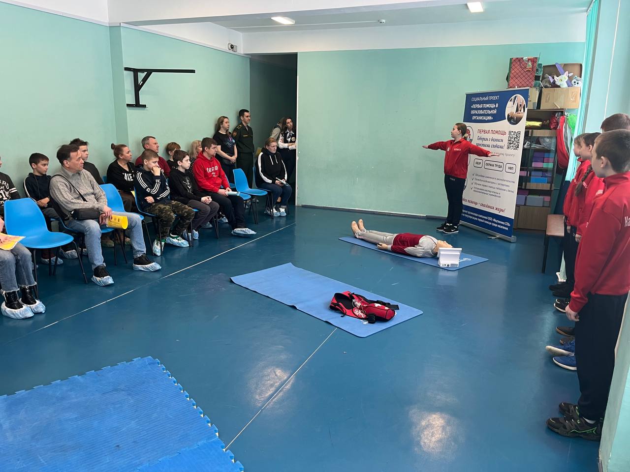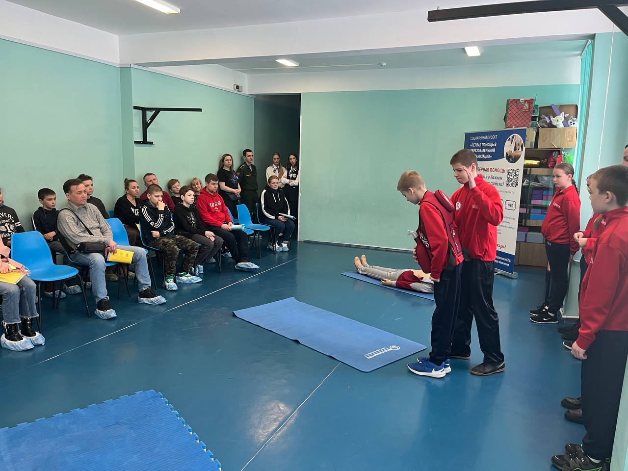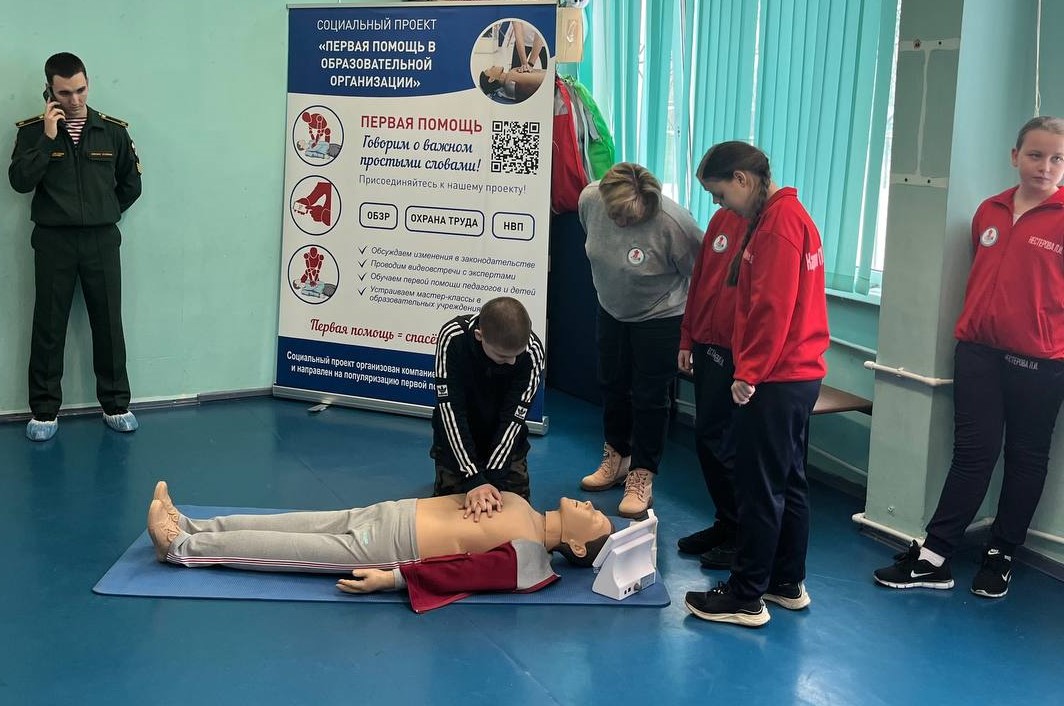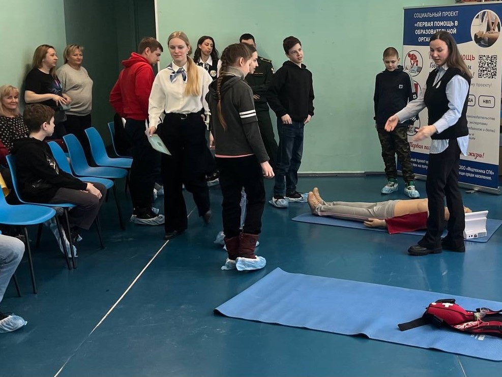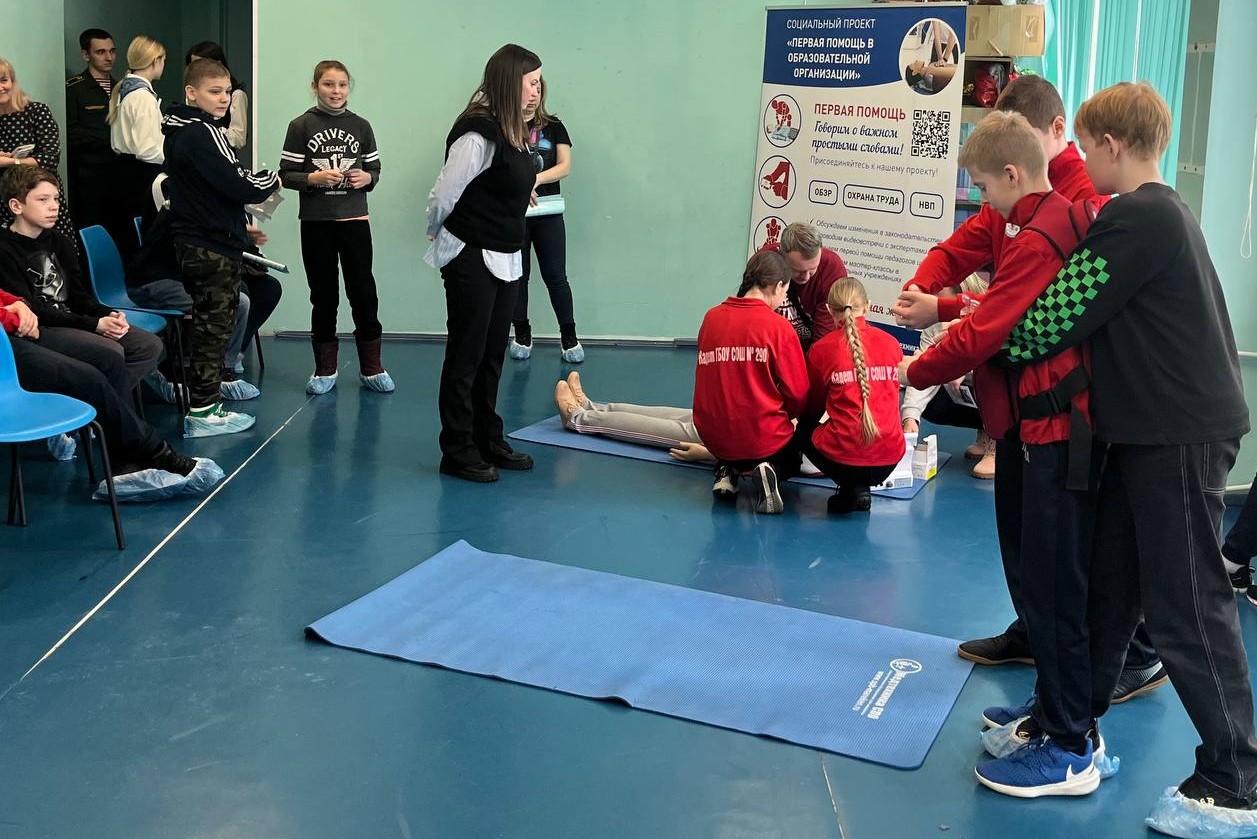 Кадеты 6 МЧС класса продемонстрировали присутствующим навыки оказания первой помощи, приобретённые в рамках участия школы в социальном проекте «Первая помощь в образовательной организации». Ребята показали, как оценивать собственную безопасность на месте происшествия, как определять наличие или отсутствие сознания и дыхания у пострадавшего, как правильно проводить сердечно-лёгочную реанимацию и переворот в устойчивое боковое положение. Также, гости узнали, что необходимо делать, когда человек подавился. После демонстрации вышеперечисленных манипуляций все желающие попробовали самостоятельно осуществить их на специализированных тренажёрах для обучения оказанию первой помощи от компании "Медтехника СПб".